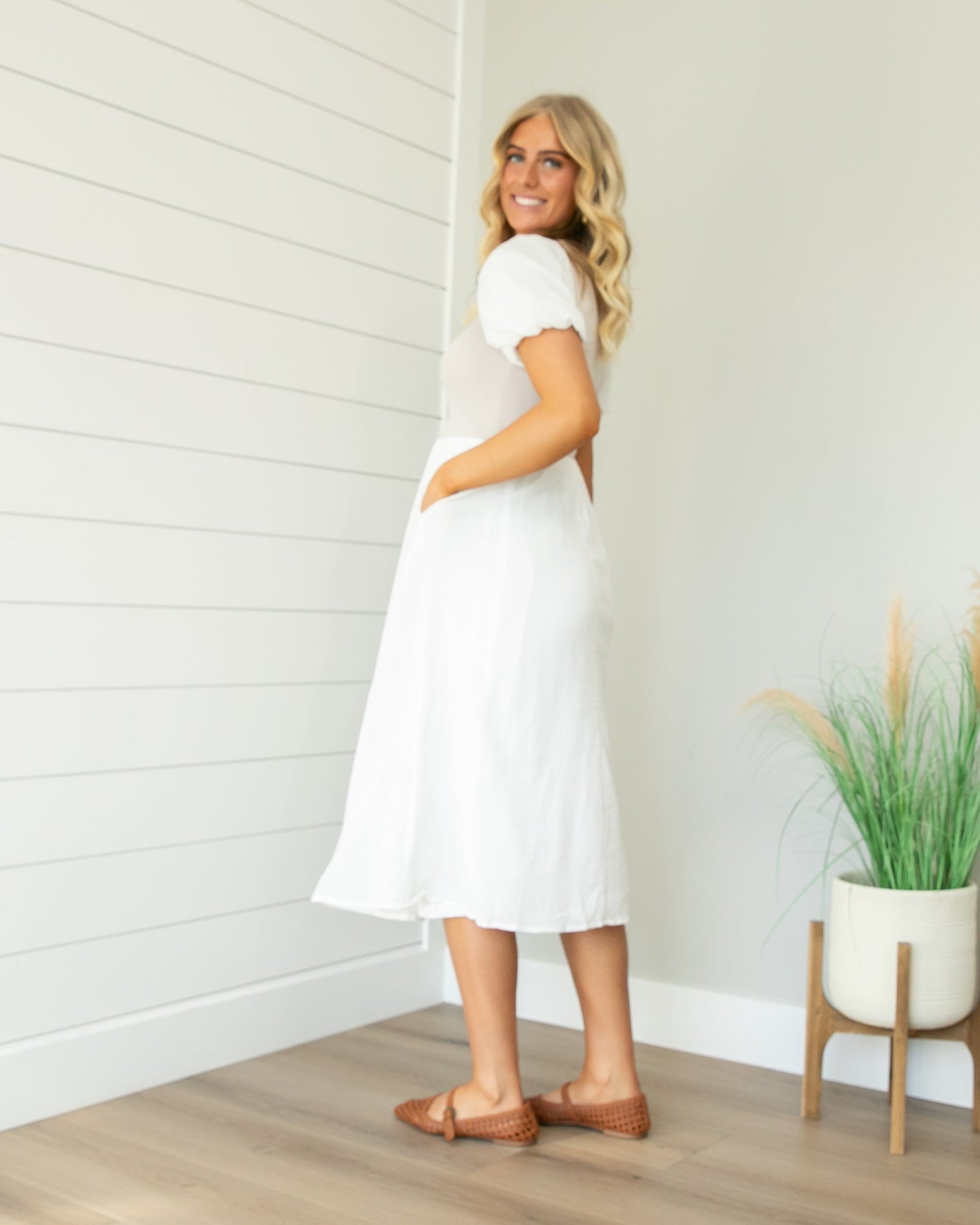 The Wendy Dress is a soft and feminine piece that is perfect for any occasion. The flowy skirt and lightweight fabric make it comfortable and easy to wear, while the puff sleeves add a cute and flattering detail. This dress is perfect for everyday wear, church, or dressing up for special occasions.