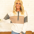 The Candice Top is a casual favorite with a cool, colorblocked design. Featuring neutral tones of cream, taupe, and charcoal, this henley-style top is perfect for layering or wearing solo. The soft fabric and relaxed fit make it an easy go-to for laid-back days.
