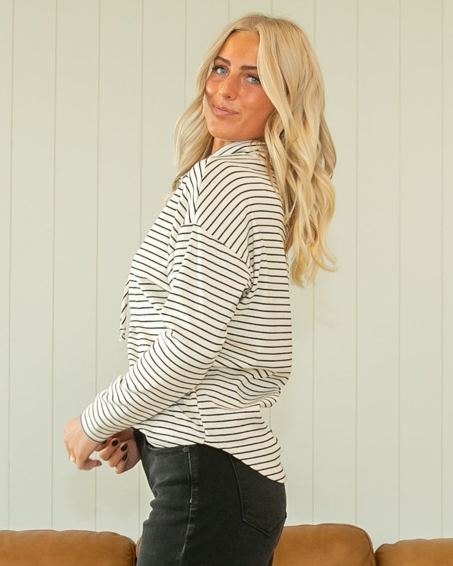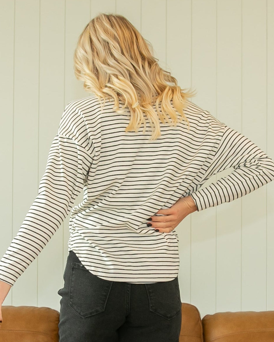 Stay chic and cozy in this black and white striped cowl neck top. Designed with soft, lightweight fabric and a relaxed fit, this casual piece is perfect for everyday wear—whether you're running errands or lounging at home. The classic stripes and draped neckline add just the right touch of effortless style.