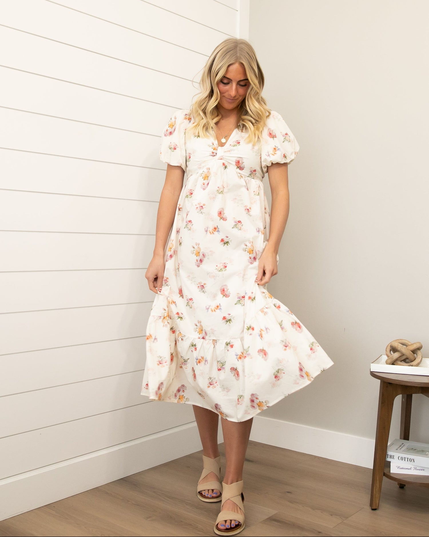 The Lynette Dress is soft, romantic, and easy to wear for any day you want to feel pretty but still comfortable. The light floral print and flowy tiered skirt give it a breezy look, while the gathered bodice adds a flattering shape without feeling tight. Perfect for church, baby showers, or spring outings.
