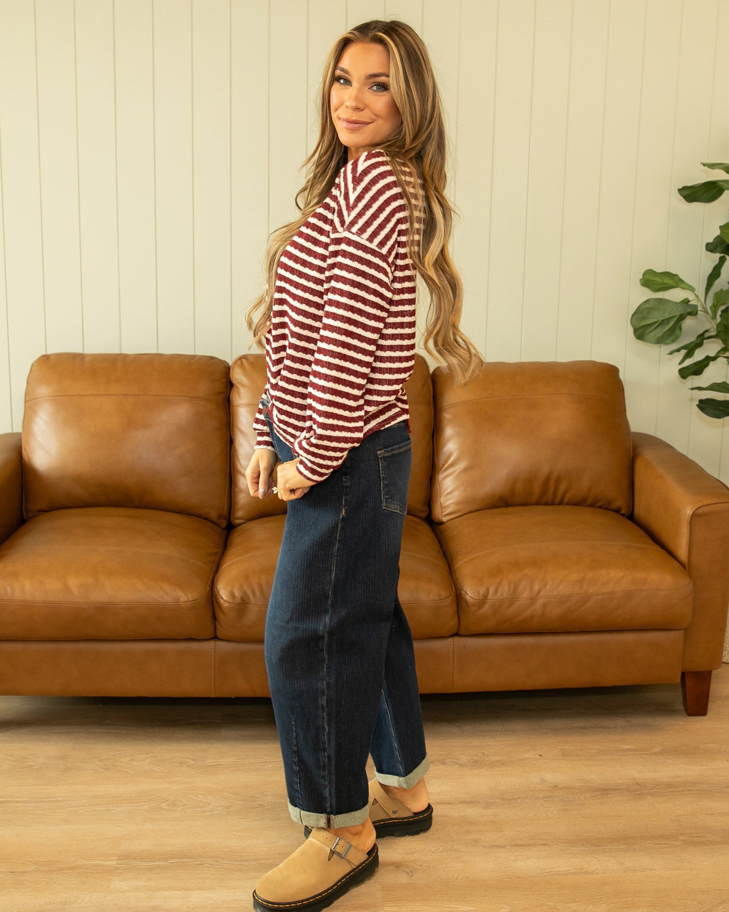 The Nan Top brings cozy charm with a touch of vintage style. Featuring a soft, textured knit and classic maroon-and-cream stripes, this top is perfect for fall layering or casual days out. The relaxed fit, button-front neckline, and drop shoulders make it effortlessly comfortable while still looking put-together.