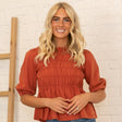 The Regina Top brings effortless charm with its rich rust tone and flattering silhouette. Designed with a smocked bodice that adds texture and shape, this top flows into a relaxed peplum hem for a feminine finish. Perfect for pairing with jeans or skirts, it’s a versatile choice that transitions easily from casual to dressed-up.