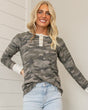 The Rory Camo Top is your go-to piece for casual days and comfy style. With its soft, cozy material and subtle camo print, this top is perfect for lounging, layering, or pairing with your favorite jeans. The contrast trim and button-front henley neckline add a unique touch that sets it apart from your basic tee. Effortlessly cool and easy to wear, it's a fall wardrobe essential.