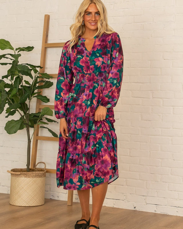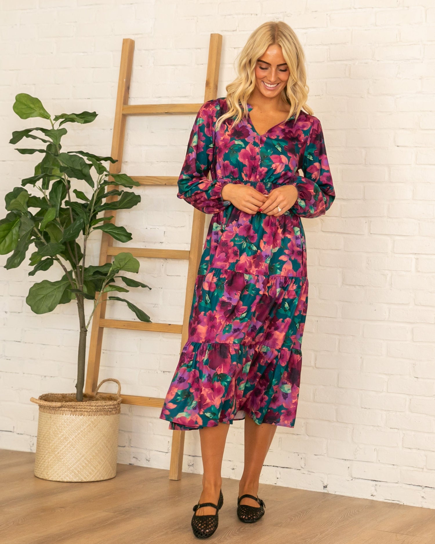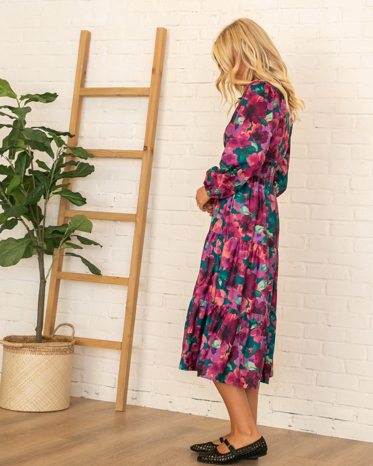 Bring bold color to your fall wardrobe with the Tianna Dress. This floral beauty features a vibrant mix of pinks and purples on a deep teal background, with a flattering v-neckline and smocked waistband for the perfect feminine fit. The tiered midi skirt flows effortlessly, making it ideal for everything from brunch to weddings.
