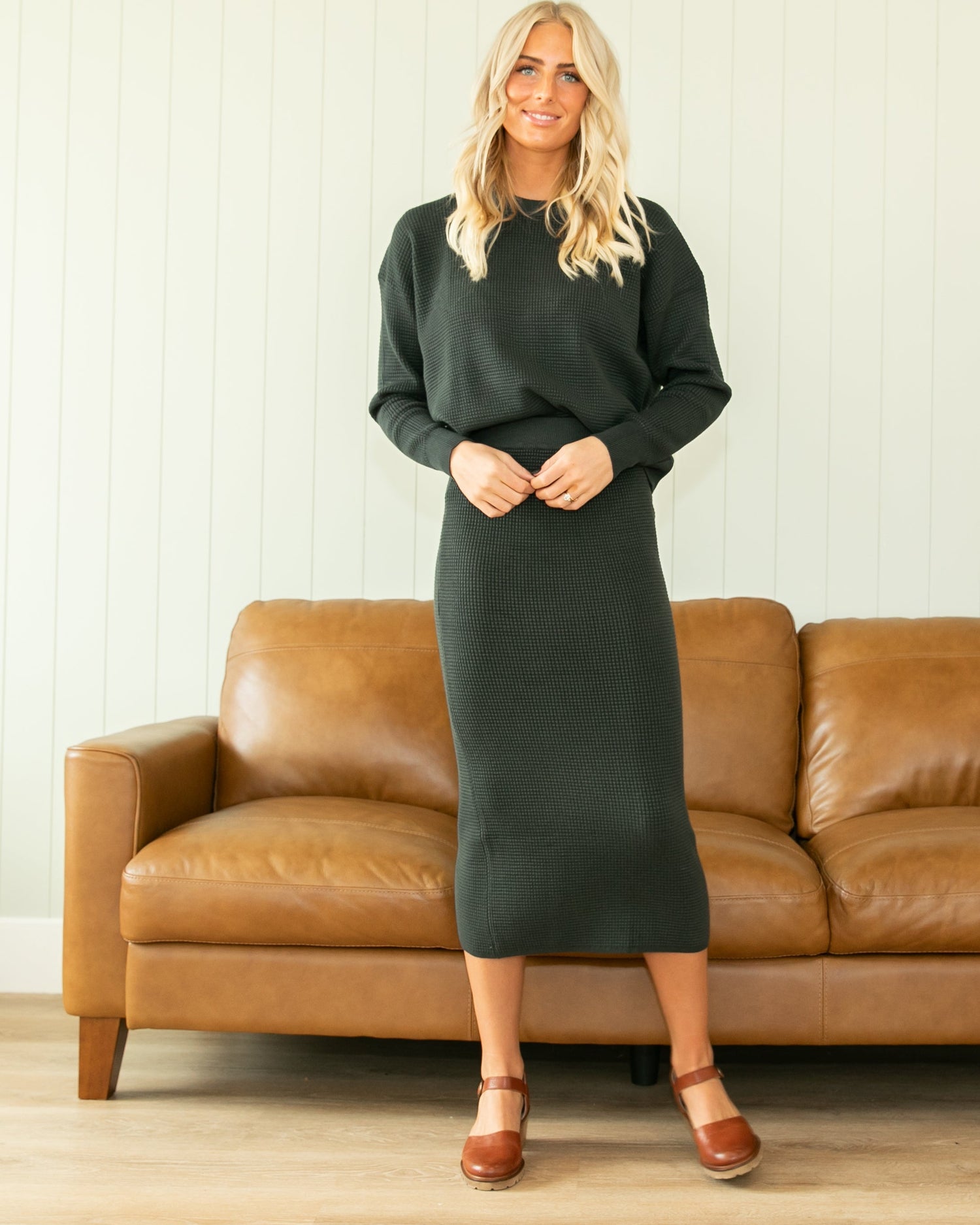 The Tristin Set offers effortless sophistication with a cozy, modern twist. Featuring a soft waffle-knit texture, this matching top and skirt duo creates a polished yet comfortable look. The relaxed-fit top pairs perfectly with the fitted midi skirt for a balanced silhouette that’s perfect for the office, church, or a casual night out.