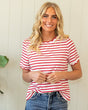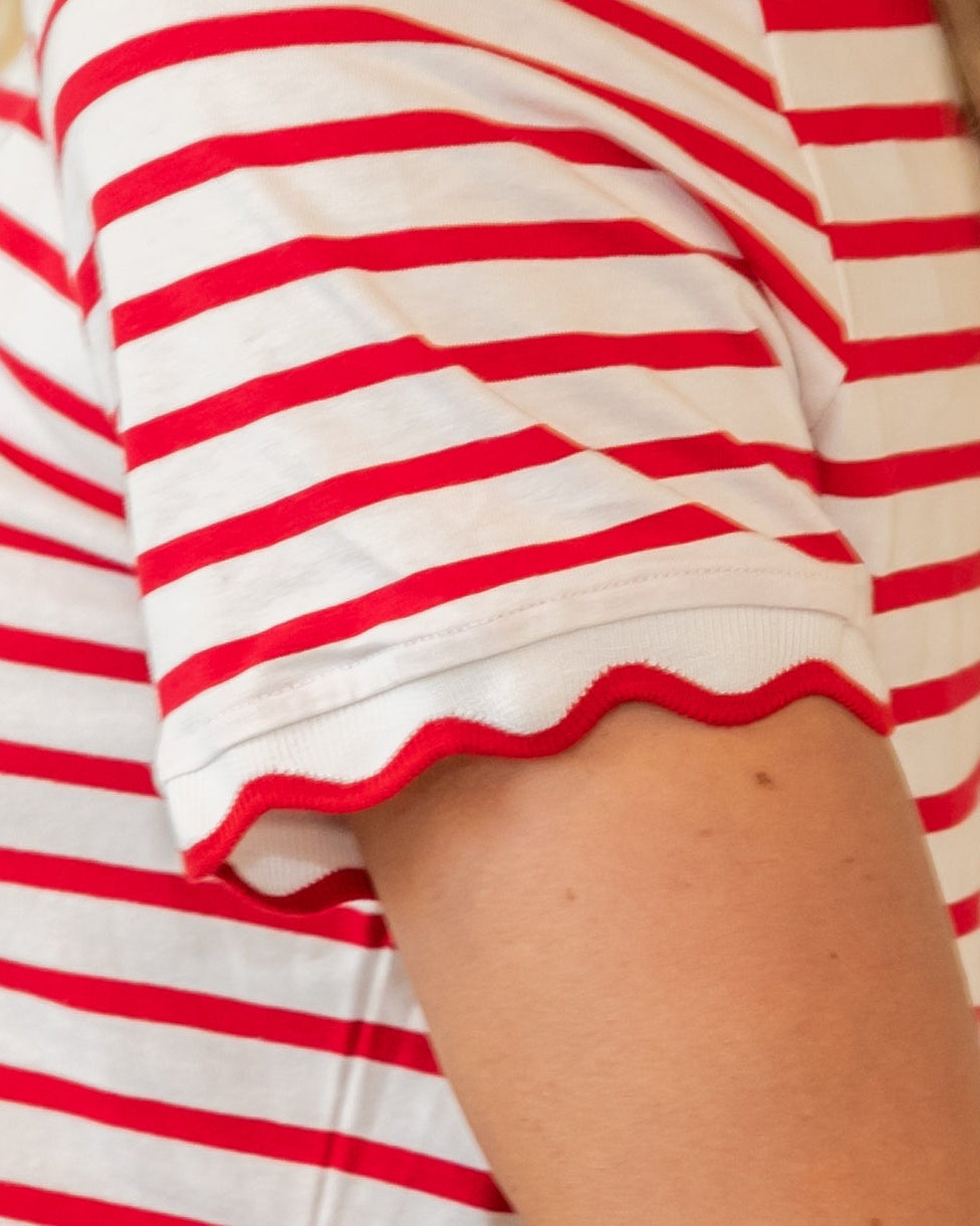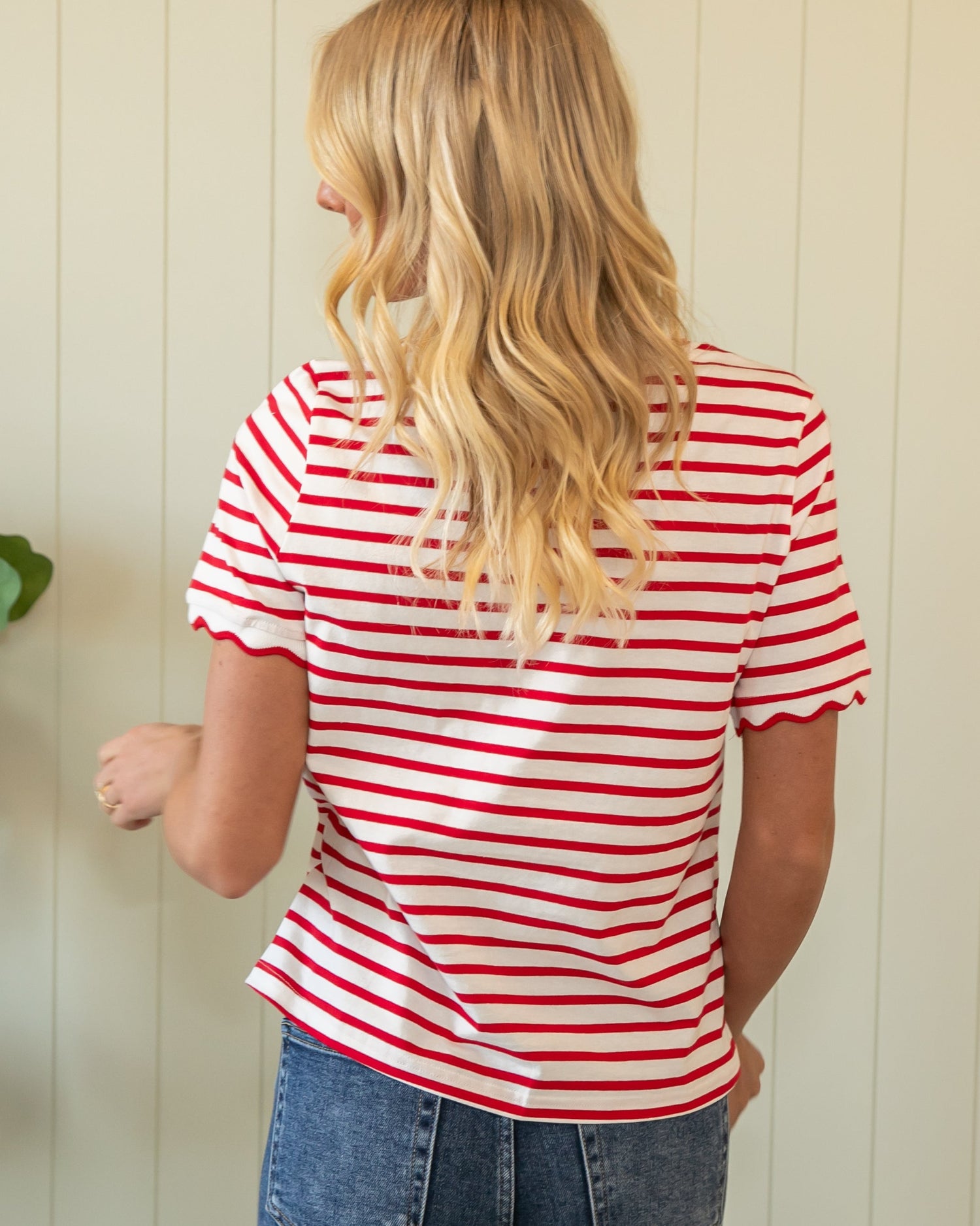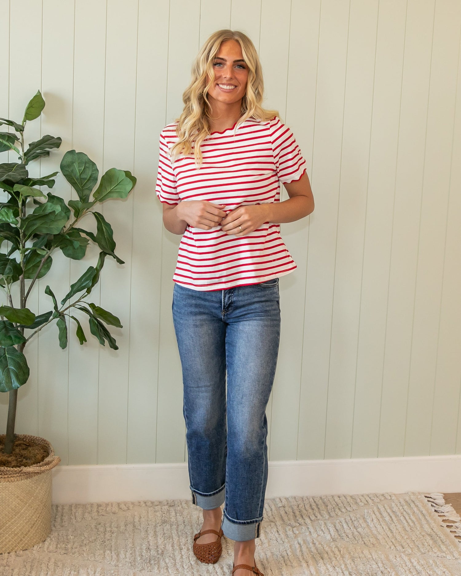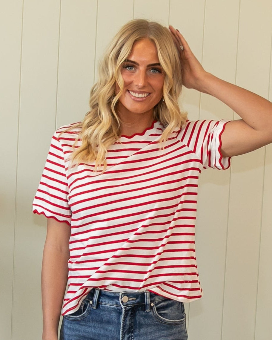 Effortlessly cute and perfect for everyday wear, the Ivie Top is a timeless striped tee with a fun, feminine twist. Featuring red and white stripes with subtle ruffle trim along the neckline and sleeves, this top adds just the right amount of charm while staying comfy and easy to style. Pair it with your favorite denim, shorts, or layered under a jacket for a look you’ll reach for all season long.