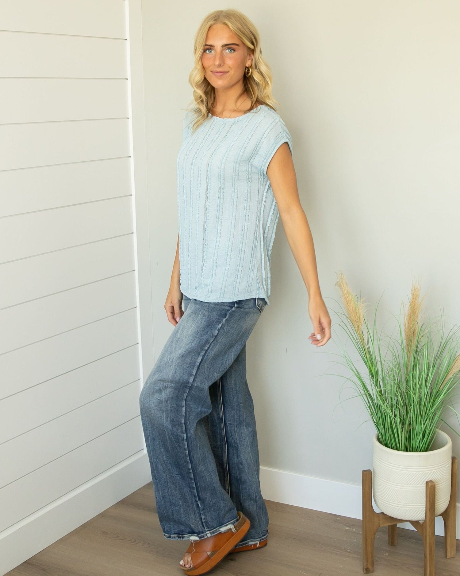 The Jada Top is a simple piece with just the right amount of texture. The soft ribbed fabric and relaxed fit make it comfortable for everyday wear while still looking put together. This top is perfect to pair with denim, shorts, or layered under a jacket for an easy outfit.