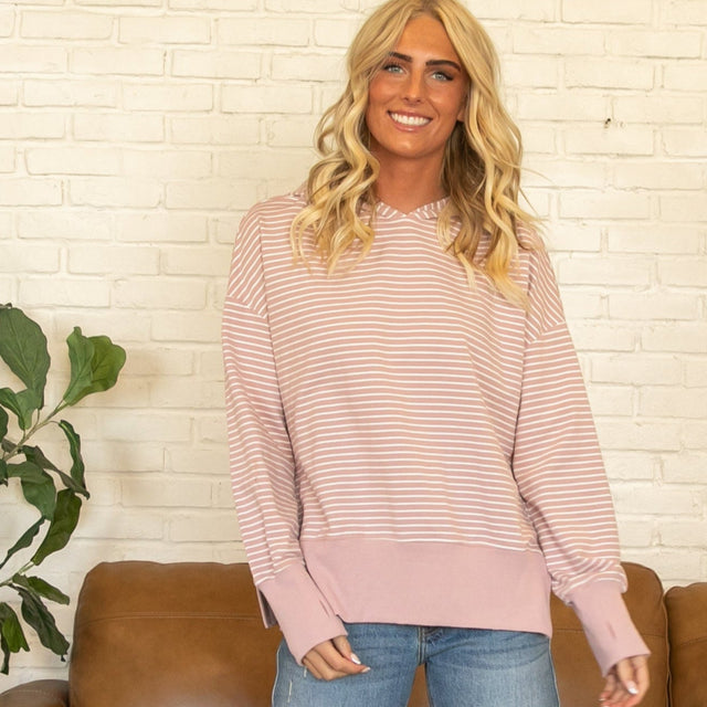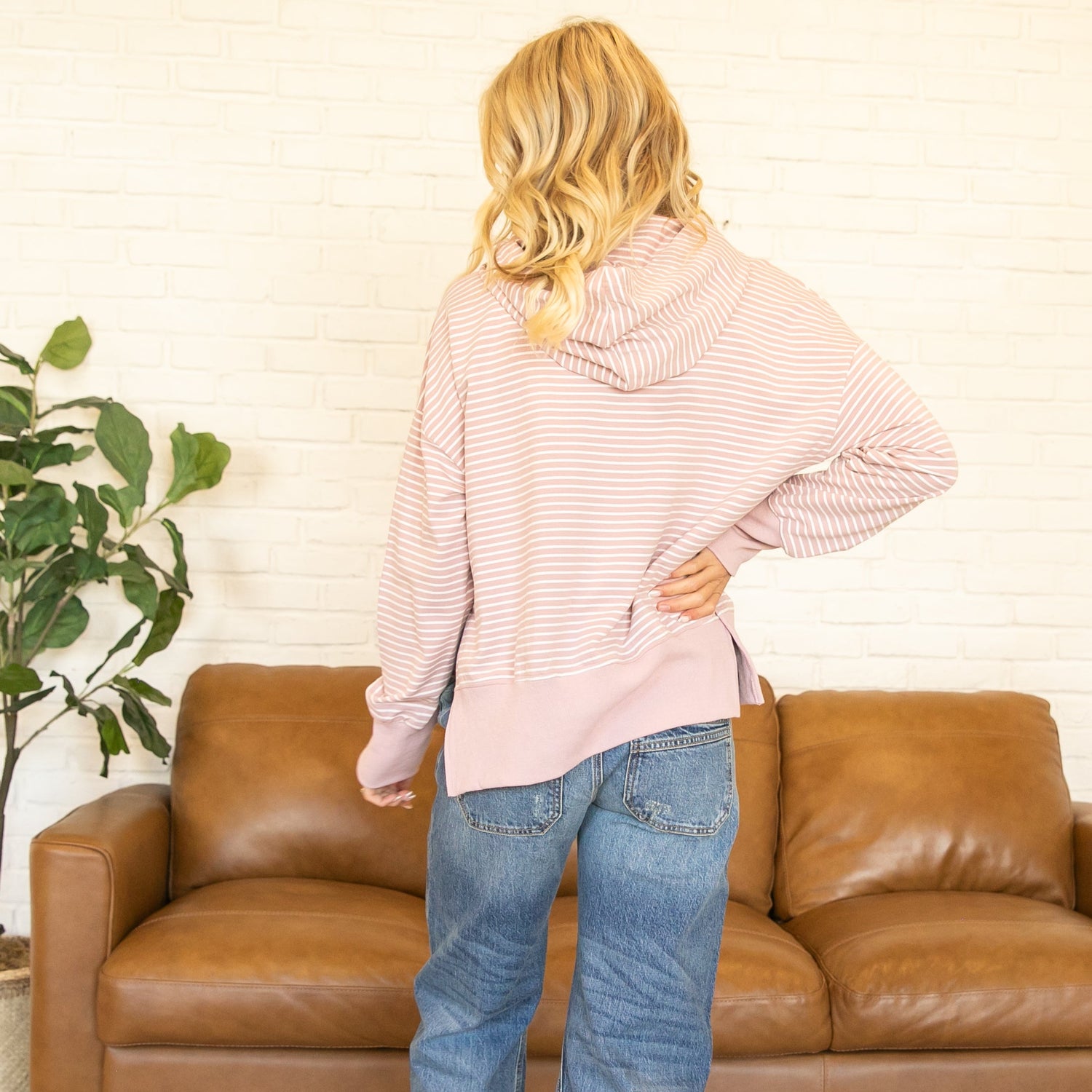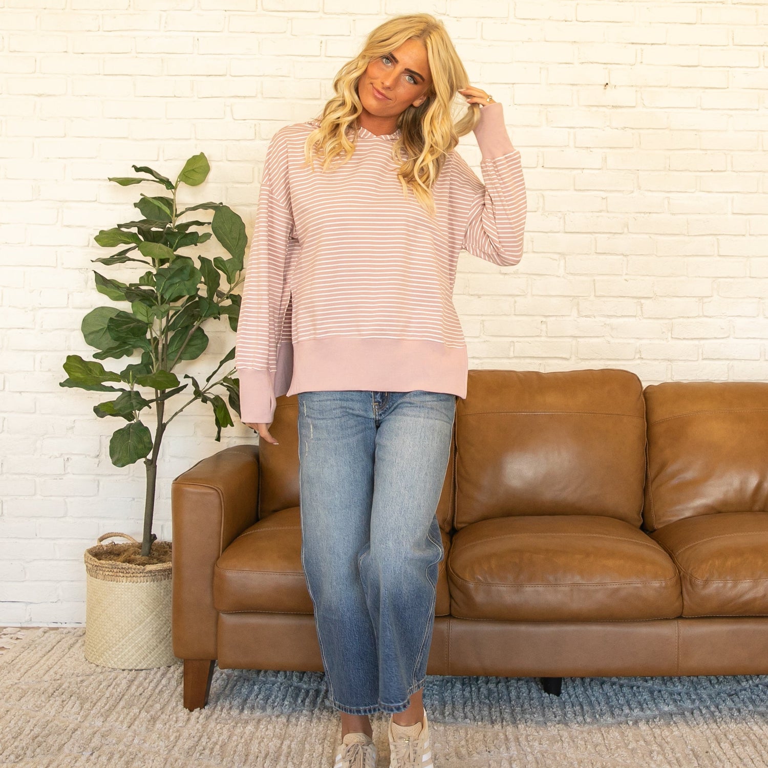The Catherine Hoodie is soft, casual, and perfect for everyday wear. Featuring a muted blush and white stripe pattern, this lightweight hoodie has a relaxed fit with side slits for extra comfort and movement. The wide hem and cuffed sleeves give it a cozy yet polished look.