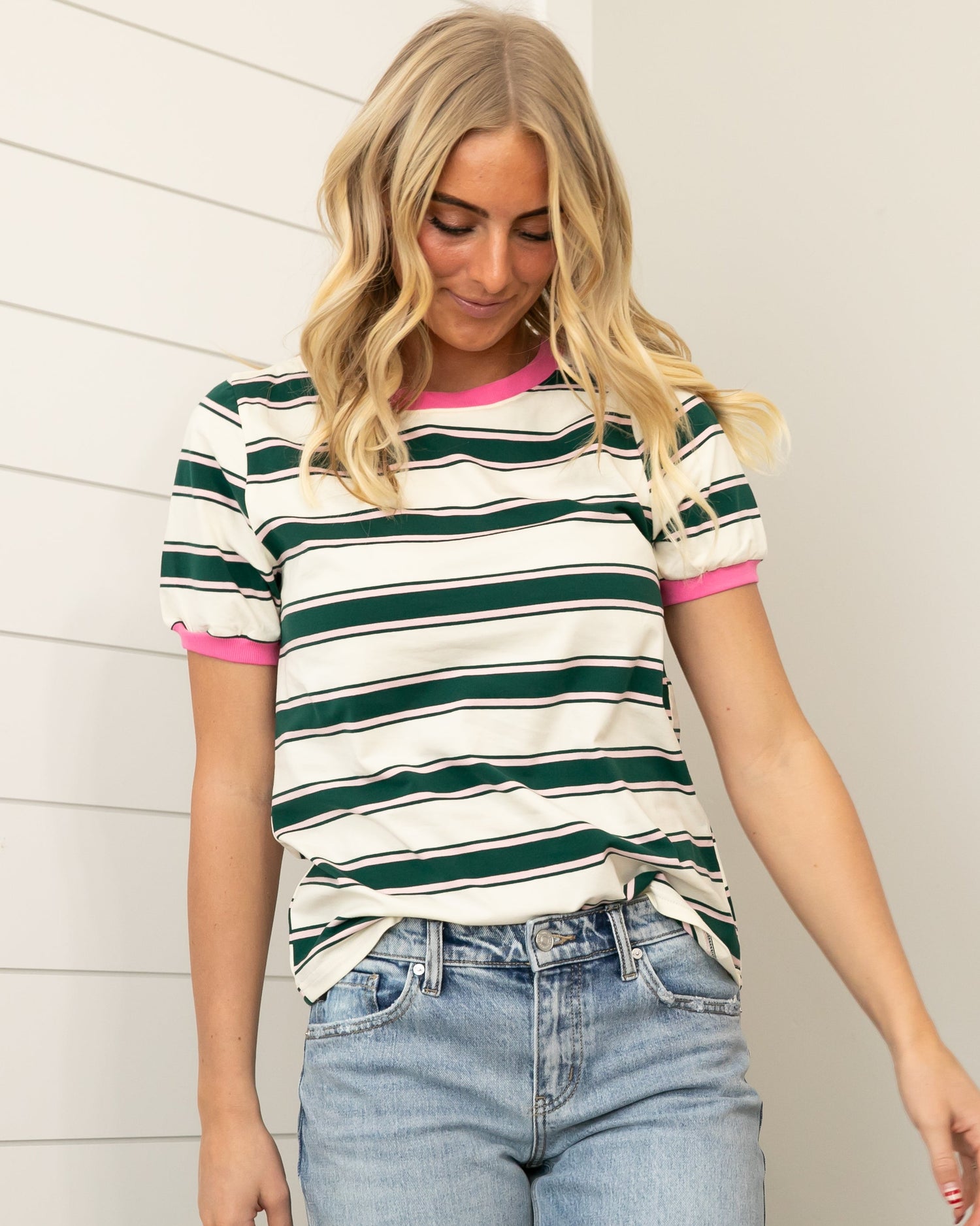 The Kadi Stripe Top brings a fresh pop of color to your everyday wardrobe. Featuring playful green and pink stripes and feminine puff sleeves, this top is both fun and flattering.