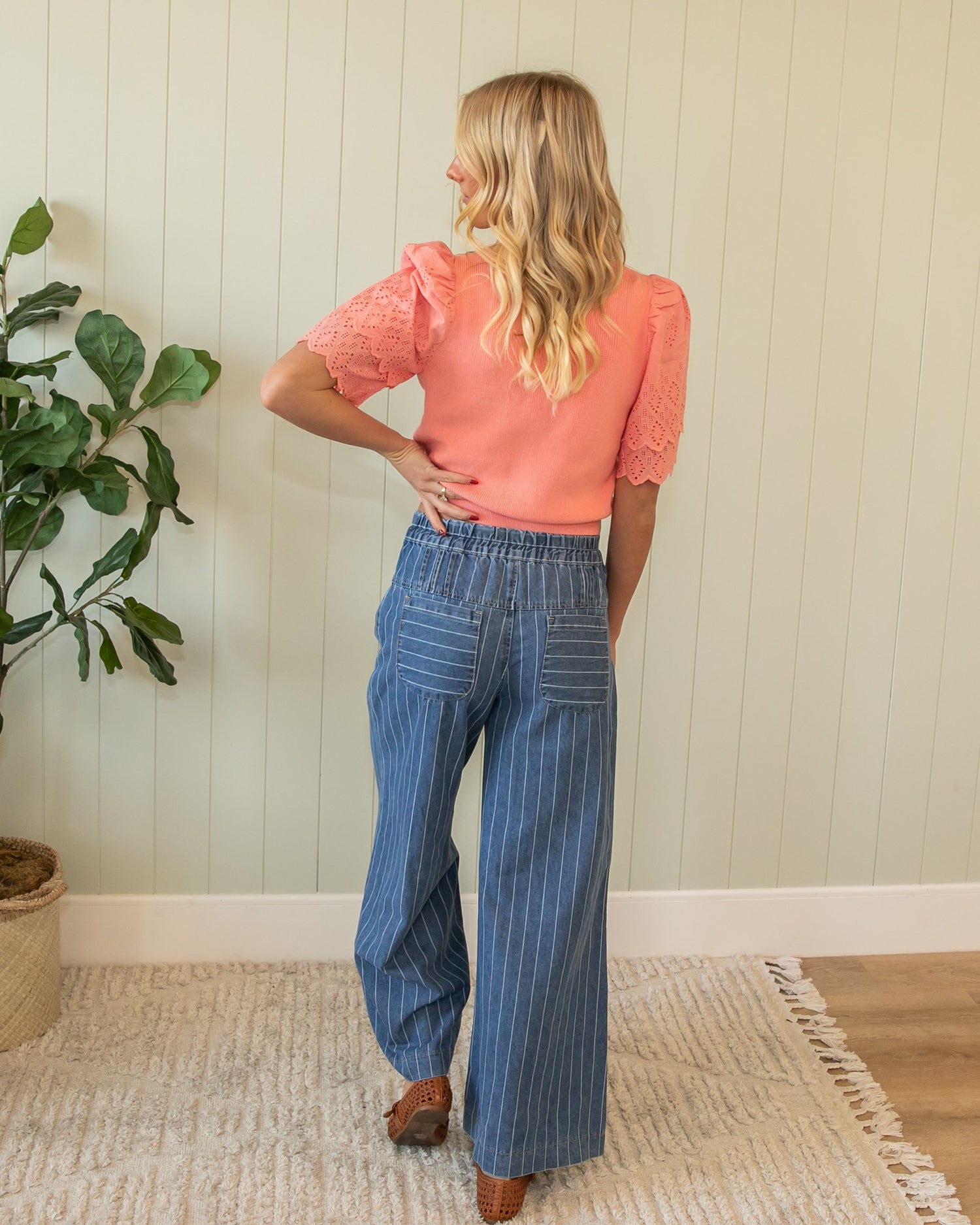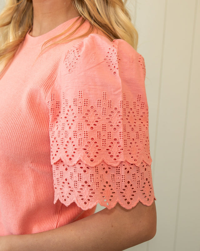 Say hello to your new go-to! The Poppi Top is a sweet and stylish knit featuring a soft coral hue with delicate eyelet flutter sleeves for the perfect touch of texture. Designed with a cropped, relaxed fit, this top is easy to dress up or down and pairs beautifully with high-waisted denim, skirts, or your favorite statement pants.